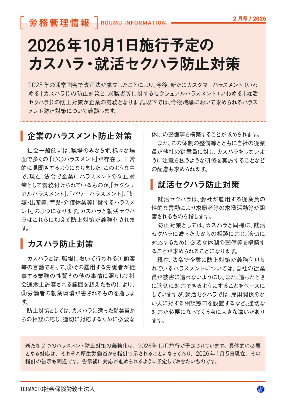 2026年10月1日施行予定のカスハラ・就活セクハラ防止対策